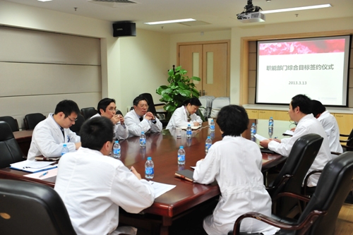 2013年3月13日,职能部门综合目标管理责任书签约仪式顺利举行,党政领导,来自各职能科室的正、副主任,支部书记及科助理出席了本次签约仪式。 本次2013年度的职能部门综合目标管理责任书沿袭了以往一贯的传统,并根据医院发展规划以及上级部门的最新要求,在评分标准方面做了更加详细的规定,采取“共性+个性”的评价方式。精炼职能部门共性部分,量体裁衣制定个性部门评分标准。在评分内容上,结合当前社会形势及上级要求,新加入了维稳信访以及廉洁防控部分,有利于我院进一步开展相关工作。此外,在本次签约仪式上每位科主任均签订了廉政承诺书,做出廉洁承诺,严格遵守八项规定,廉洁奉公,爱岗敬业,并认真贯彻执行党风廉政建设责任制的规定,切实履行好职责。 仪式中,院领导班子汇报了2013年我院工作的一些计划,认真听取了各科的意见和建议,并对责任书中有疑问的部分进行了耐心的解答,承诺会顾全大局,安排并协调好每个科室的工作。同时,党政领导们对每个科室提出要求与希望,指出要攻坚克难,努力为医院建设建言献策。相信通过本次综合目标管理责任书的签订,更推进了院领导与各基层科室的沟通,为医院精神文明、后勤保障等各方面打下夯实的基础。