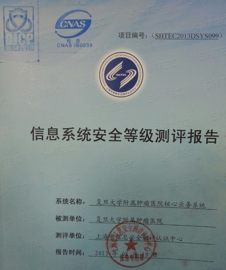 2013年6月26日至8月16日,上海市信息安全测评认证中心对我院信息中心核心业务系统进行了系统安全等级测评工作。本次安全测评的范围主要包括业务网络及HIS、EMR、RIS等业务应用。安全测评通过静态评估、现场测试、综合评价等相关环节和阶段,从物理安全、网络安全、主机安全、应用安全、数据安全与备份恢复、安全管理制度、安全管理机构、人员安全管理、系统建设管理、系统运维管理等十个方面,对核心业务系统进行综合测评。