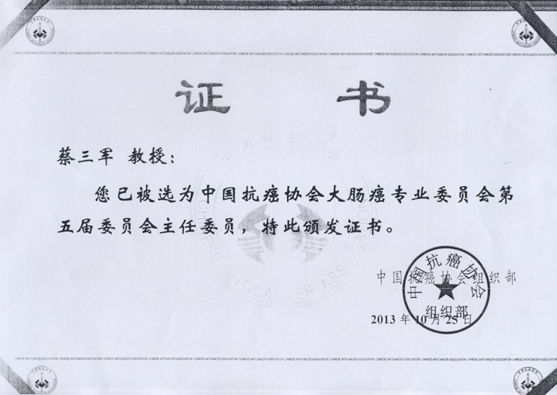 日前,在福建省福州市召开的中国抗癌协会第五届大肠癌专业委员会换届会议上,我院大肠外科主任蔡三军教授当选为中国抗癌协会大肠癌专业委员会第五届专业委员会主任委员。