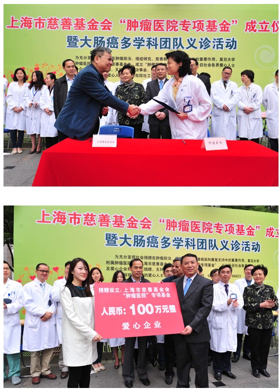 仪式上,顾文英副书记代表我院同上海市慈善基金会签订专项基金协议。金闽珠副理事长代表上海市慈善基金会现场接受了首位社会爱心人士捐赠的现金支票100万元人民币,并为其颁发捐赠证书。据悉,首笔善款将定向捐赠给复旦大学附属肿瘤医院大肠外科。肿瘤医院大肠外科主任、中国抗癌协会大肠癌专业委员会主任委员蔡三军教授表示,随着大肠癌发病趋势的日益走高,我们将把这笔善款用于大肠癌的防治宣传,普及正确的防癌抗癌理念,造福市民。