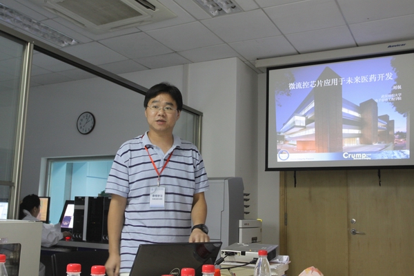 作为该领域的同行和生物医药分析合成筛选芯片和传感检测芯片等方面的专家,刘博士在参观了核医学科PET分子影像探针药物实验室和自制的微流芯片系统后,为我们介绍了他在微流体芯片领域的最新进展。其间,他与核医学科的放射化学工程师张勇平和王明伟博士等交流了微流体芯片的自动化控制系统,讨论了科研合作。张勇平工程师和王明伟博士分别在国内外从事放射药物相关的微流芯片系统的设计与研究并已有初步成果。