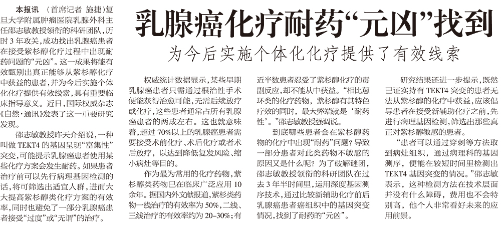 【新民晚报】乳腺癌化疗耐药“元凶”找到