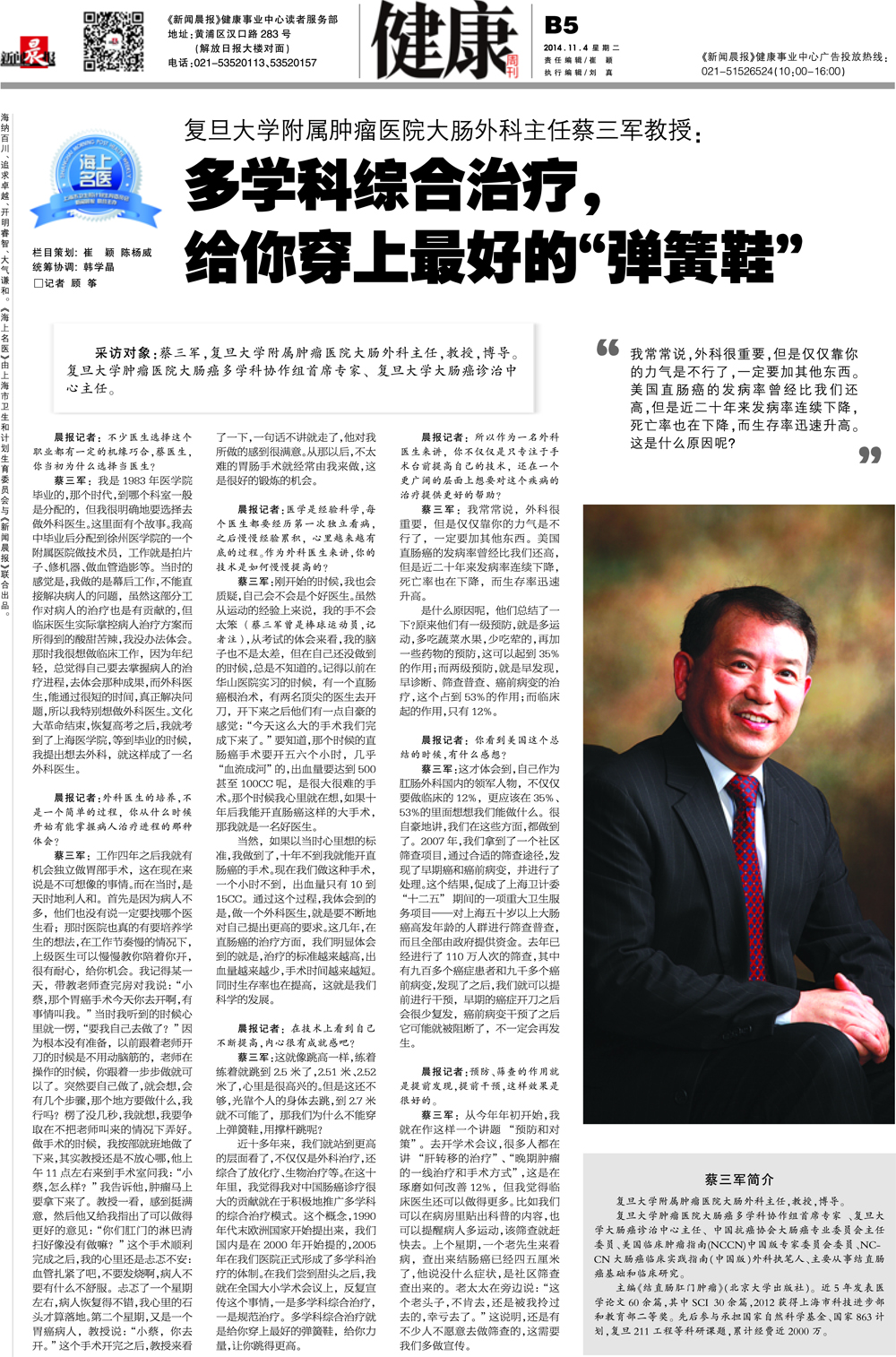【新闻晨报】复旦大学附属肿瘤医院大肠外科主任蔡三军教授:多学科综合治疗,给你穿上最好的“弹簧鞋”