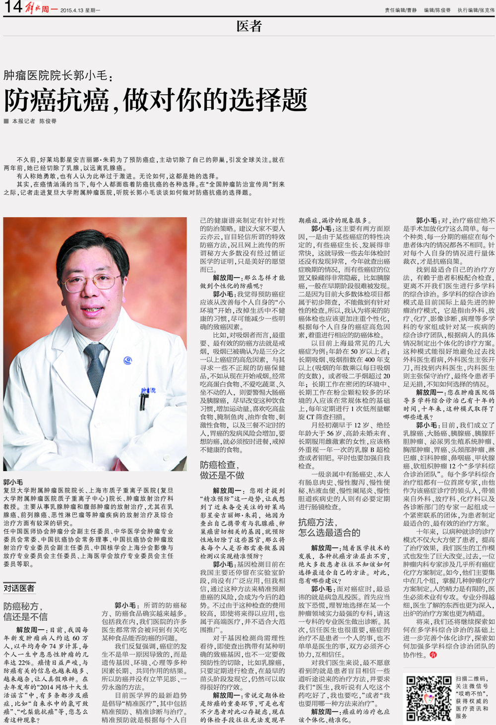 【解放日报·医者】肿瘤医院院长郭小毛:防癌抗癌,做对你的选择题