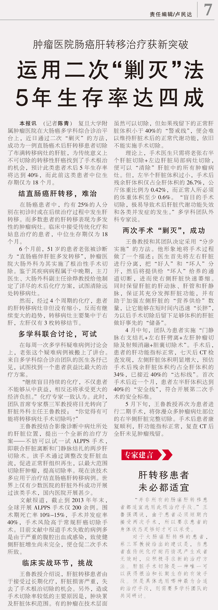 【文汇报】肿瘤医院肠癌肝转移治疗获新突破:运用二次“剿灭”法 5年生存率达四成