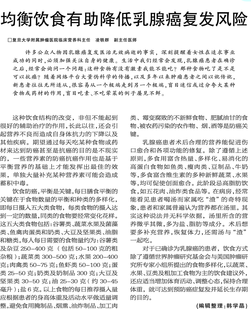 【新闻晨报】均衡饮食有助降低乳腺癌复发风险