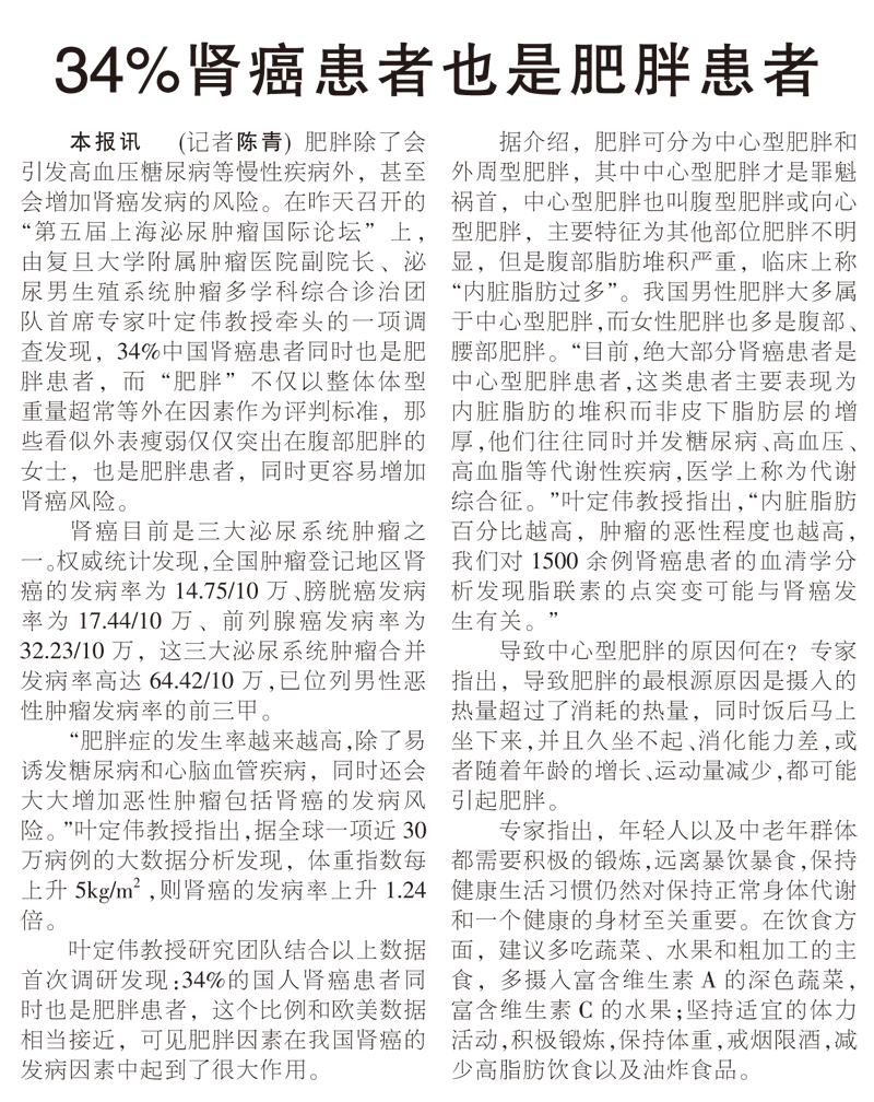 【文汇报】34%肾癌患者也是肥胖患者